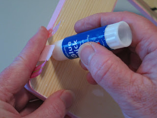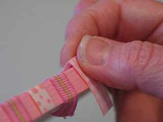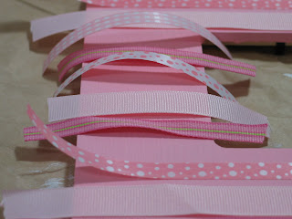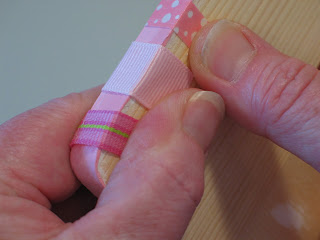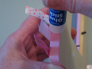 I used a couple of different textures for this project. The plaid and the polka dots ribbons are a paper ribbon with a slick coating. This type works but can be a bit tricky- sometimes the coating starts to come off once the glue hits it and sometimes you have to "encourage" the ribbon to stick.