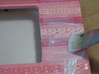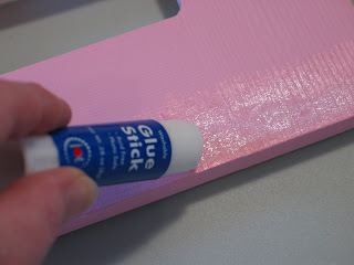 Now things start to get a bit interesting. Apply a nice coat of glue to the edges and the back of your fame. Then wrap the ribbon around to the back and you'll most likely need to hold the ribbon in place for a few beats to get the sticking to happen.