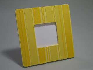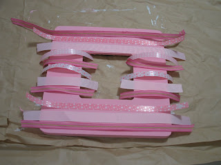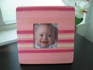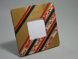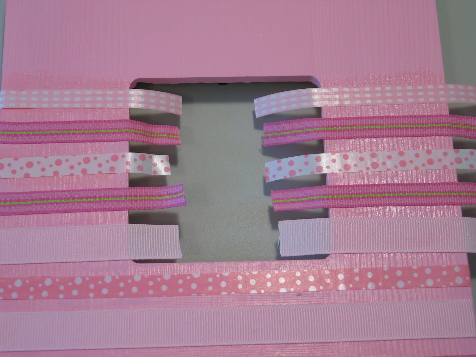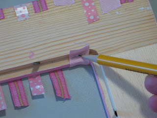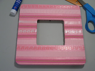 Now comes the fun part! Cut out strips of ribbon long enough to fold over the edges of your frame, around to the back. You can use as many kinds of ribbon as you want: every strip different, three kinds, all one kind. Just play around a bit- that's what it's all about, right?