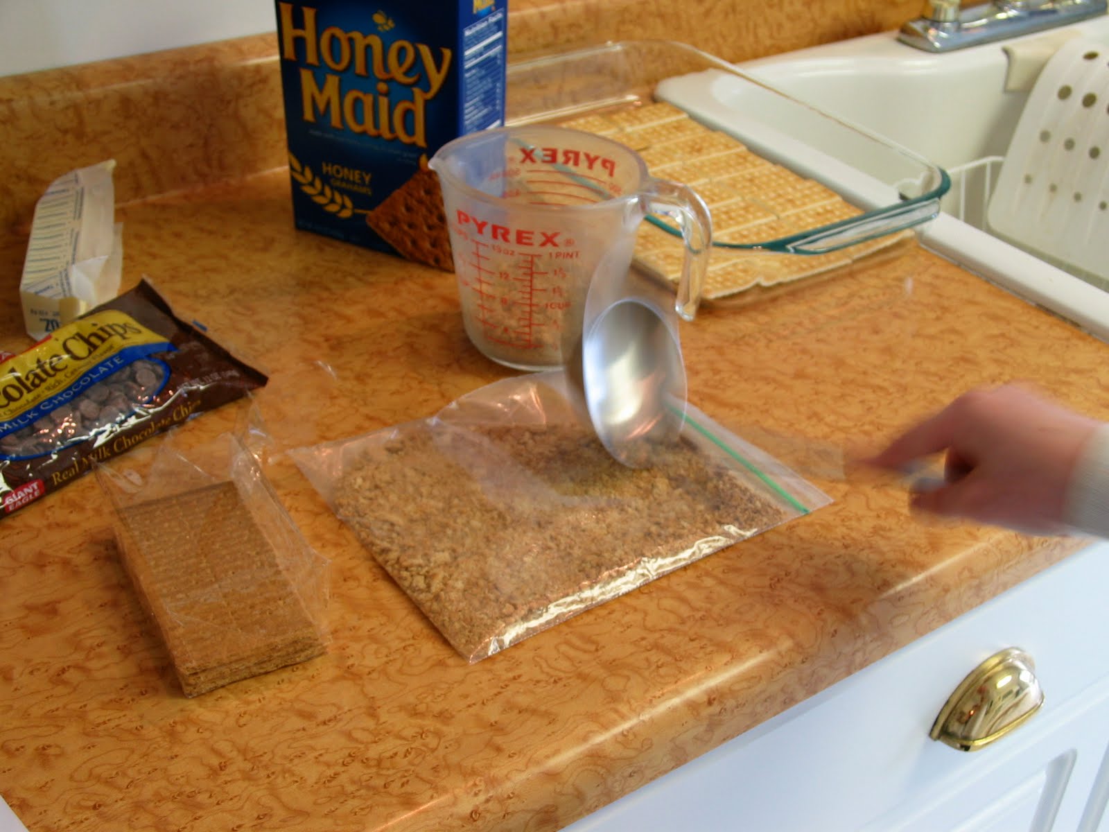 My daughter has always loved baking and we've begun to move into some new cooking territory other than stirring up brownies and tossing the salad. One of her self-proclaimed specialties is pancakes and she regularly invents new concoctions using unusual ingredients or omitting ones that always seemed so necessary before. Like eggs. But her flapjack adventures generally turn out to be delicious. She has a certain gusto about her and that quality carries over to her cooking. When I mentioned that the graham crackers she was wailing on with the back of a soup ladle needed to be crushed very fine, she assured me in a low, confident, conspiratorial voice, "Oh, I don't think we'll need to worry about that."