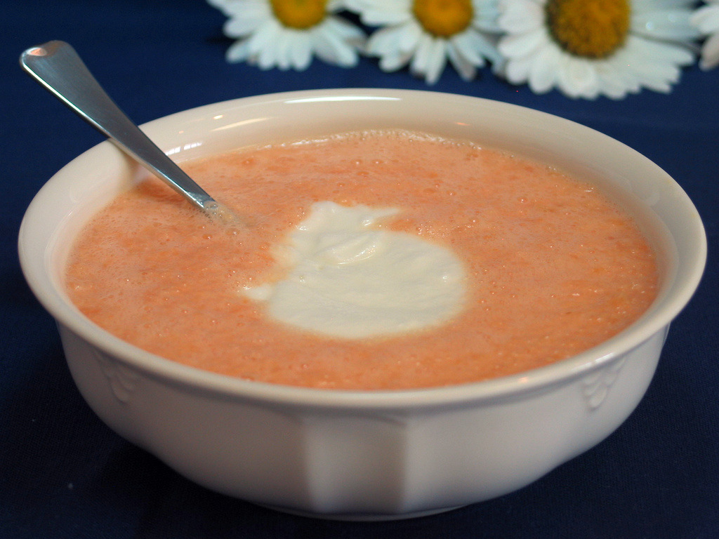 M-m-m-m-m, juicy sweet cantaloupe, I've been waiting for you. M-m-m-m, fresh chilled cantaloupe cut into pieces and eaten with my fingers. Fruit salads, that fruit salsa thing for the grilled angle food cake, but oh.... Cantaloupe Soup.Four ingredients-