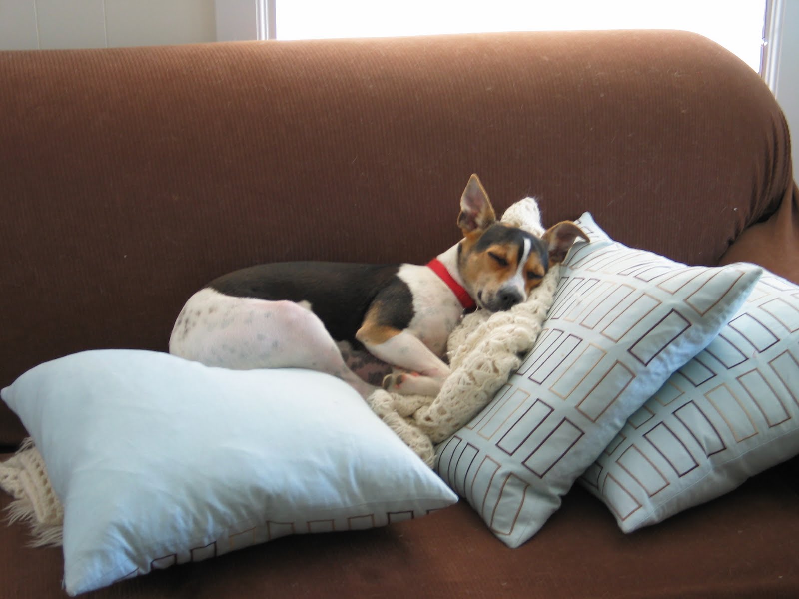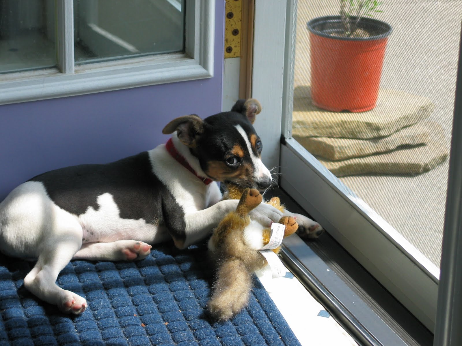 Frequently mistaken for Jack Russells, Rat Terriers have a less aggressive temperament and are not as high strung. They also have pretty solid couch-potato genes. When we first brought Remy home, he took one look at the couch and dove in among the pillows. He loves to rest and cuddle. Our Remy is loyal, loving, very sensitive to our emotions, and always in a happy mood. But when his "On" switch has been flipped he tears around like a small tornado.