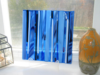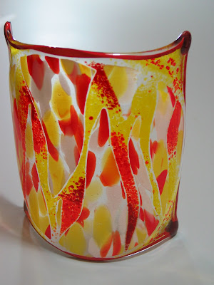 When you place a candle behind the luminaria, it creates a lovely glow. This piece started life on an 8-inch round glass as an exercise in cutting curves. Once it was fused I didn't know what to do with it. So I set the round piece on an 8-inch square, edged it with the glass spaghettis noodles, put round button beads in each corner, and filled the corner spaces with more frit. Once it was fused again and then slumped it had a nice scalloped edge which I think looks nice with the motion and curves of the "flames".