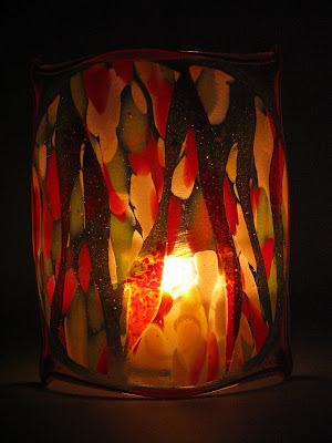 This project is a candle luminaria. It is made with specialty glass and frit (crushed glass) and then fused and slumped.