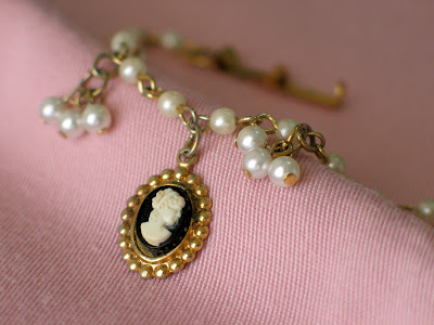 This was my favorite bracelet when I was a kid. It's very inexpensive and is missing two sets of the "pearl" tassels. I used to sit in church and move the tassels around on the chain. No wonder they have gone missing. I remember feeling so sophisticated wearing this because cameos, after all, are classic.