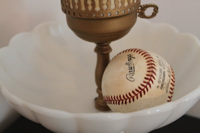 So the thing with our bowl lamp is, what about the bowl? It has been receptacle to the baseball that my husband caught off an Andy Van Slyke homer at a Pirates game years ago but other than that.... what? Does anyone know what is supposed to go in the bowl? I did see a photo once of one with plastic flowers in the bowl but plastic flowers aren't really my go-to decor choice. Our bedroom is currently decorated in Late Hodge-Podge: both of our childhood dressers (painted a matching field green), a treadle sewing machine that belonged to my husband's grandmother, complete with drawers of sewing notions and all the accessories, and the bed but no head board just a Chinese worker shirt hanging on the wall that my folks brought back for Big Un. It never fit him- the Chinese seamstress who was suppose to custom make the shirt for my husband refused to believe that any human actually had those measurements. Guess there aren't that many 6'6" Chinese folks with the wingspan of a Condor.