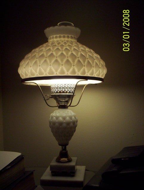 We found this lamp in one of the (now burned to ashes) sheds after we bought our old farm place. I know nothing about milk glass other than it comes in other colors besides white and sometimes has hobnails. Our lamp is wired for electric so I'm not going to go out on a limb and call it a rare, very old piece other than the previous owners of our farmhouse seemed to have been