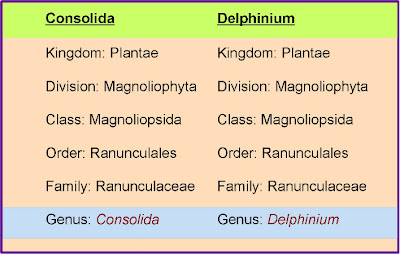 The larkspur, of the genus Consolida, is an annual version of the Delphinium and is a member of the buttercup family Ranunculaceae, native to western Europe through the Mediterranean region east to central Asia and naturalized in North America. Delphinium, also called larkspur (because that makes things so much more fun for we mere mortals), are also in the Ranunculaceae family but their genus is Delphinium, not Consolida. Right? Let's look at the scientific classification charts for the two to see if that helps (larkspur on the left, delphinium on the right):