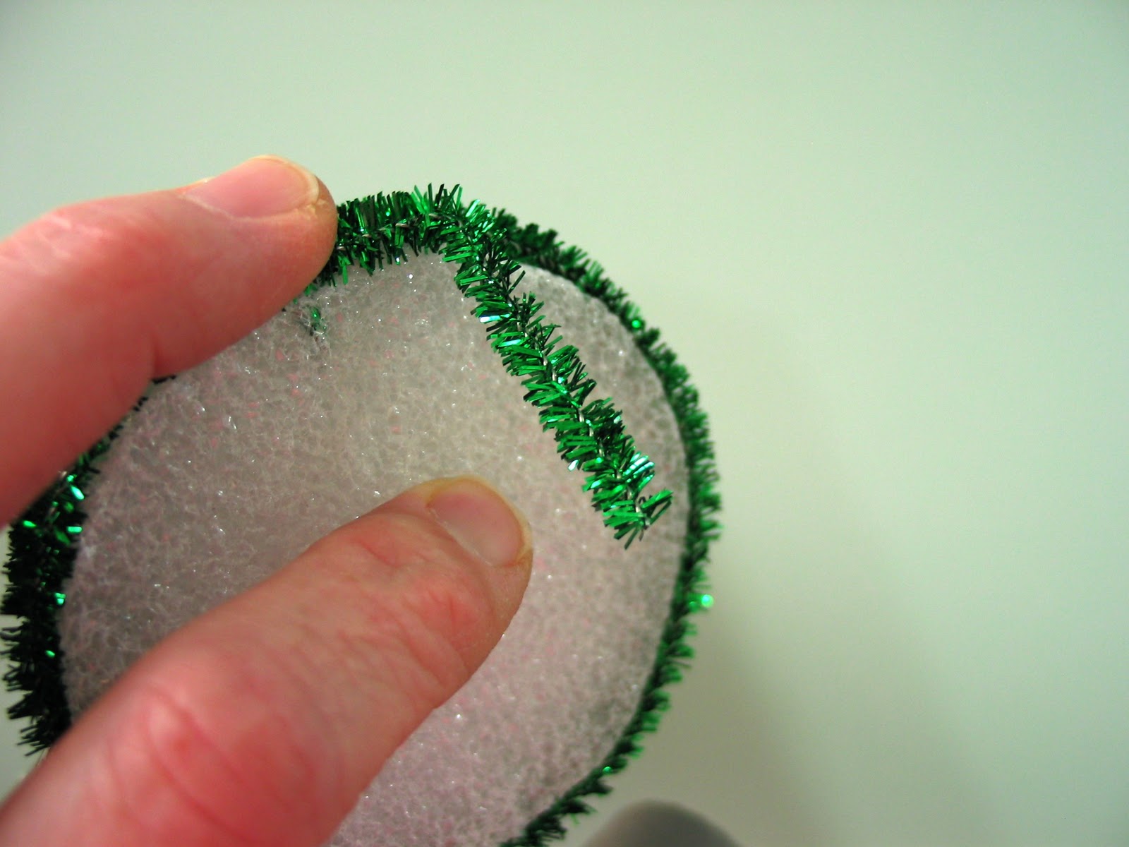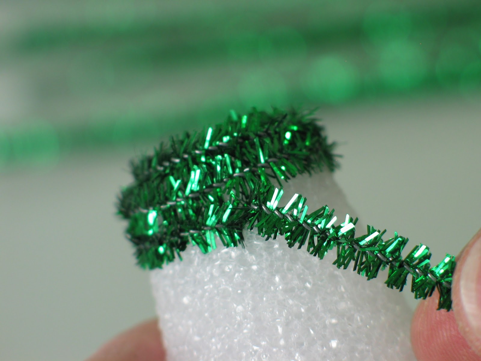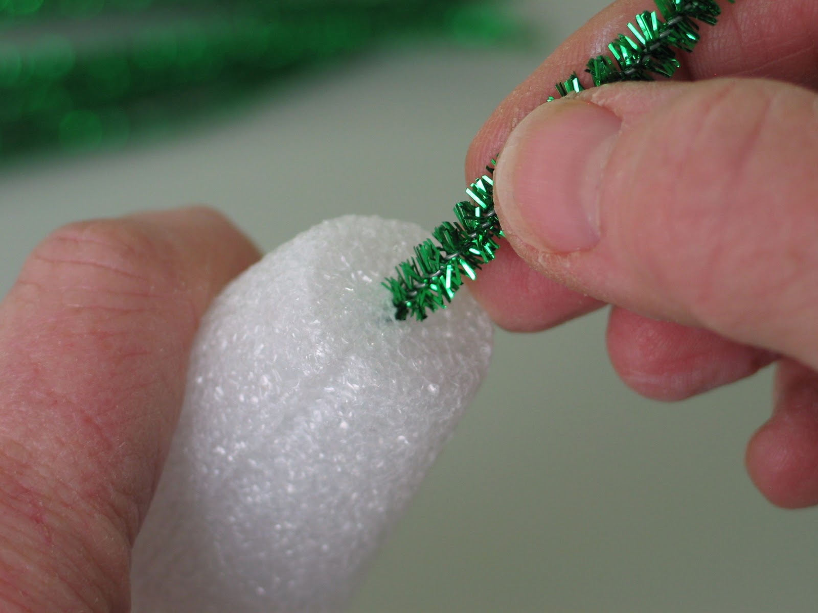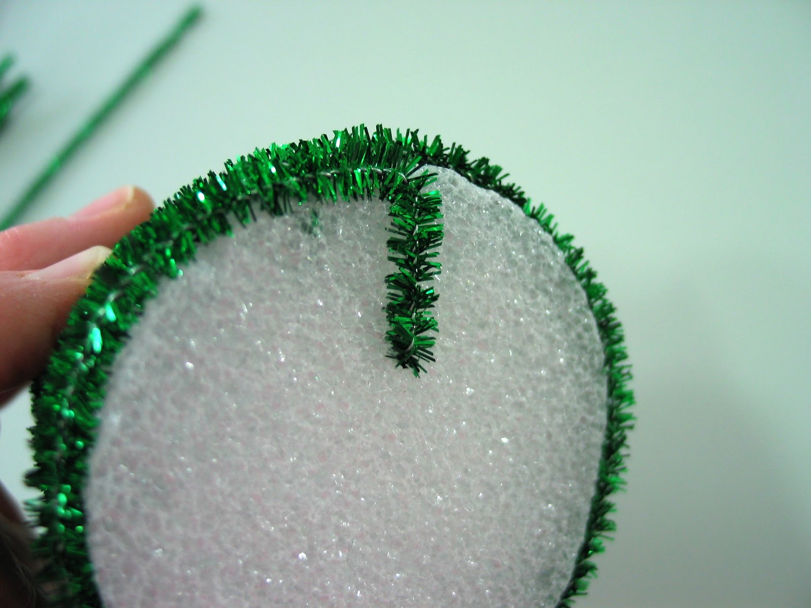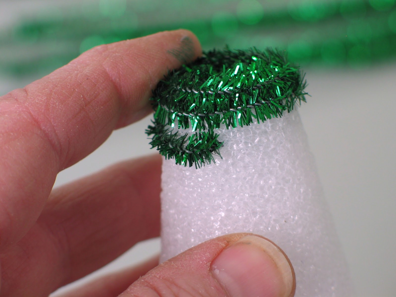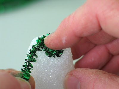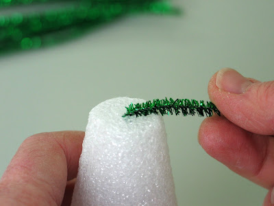 The first stem should make it over the edge of the flat top on the cone. The nice thing about the sparkly pipe cleaner is that it sort of sticks into the styro a bit to hold on. We'll talk in a minute about the softer pipe cleaner.