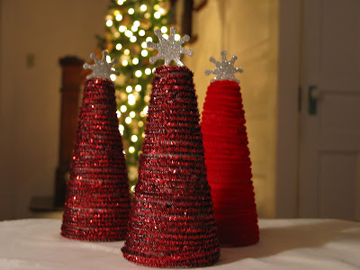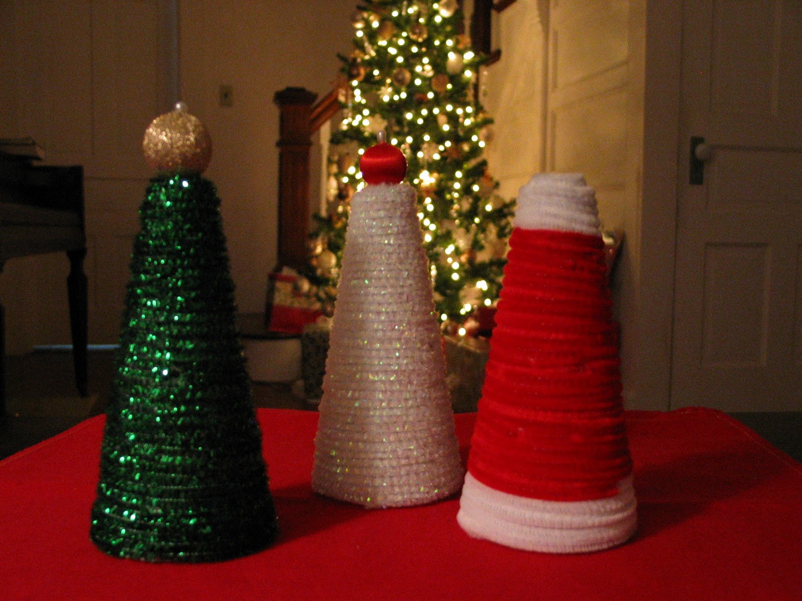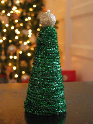 So there you go- easy little trees for your Christmas decorating needs. My mind is already churning for this year- maybe an entire Christmas tree forest with trees of different sizes, some fuzzy, some sparkly, maybe some wrapped with ribbon. Oh boy, the possibilities.