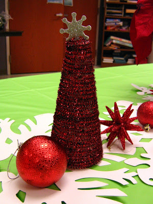 The white tree you see above (in the middle) is made with the sparkly white pipecleaner and got lots of compliments. People had no idea what it was made from. Then we have a fun little Santa's Hat tree made from the softer pipe cleaner. There was a pom pom on top but it apparently went on back to the North Pole, never to be seen again. The white at the top of the Santa Hat tree gave me an ornery time- it didn't want to stay put.